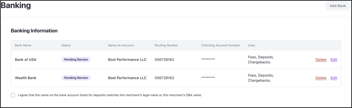 The Banking Information step allows users to securely add and manage bank accounts for transactions, including deposits, fees, and chargebacks. This step ensures that the merchant's banking details align with their legal business name or DBA (Doing Business As) name.