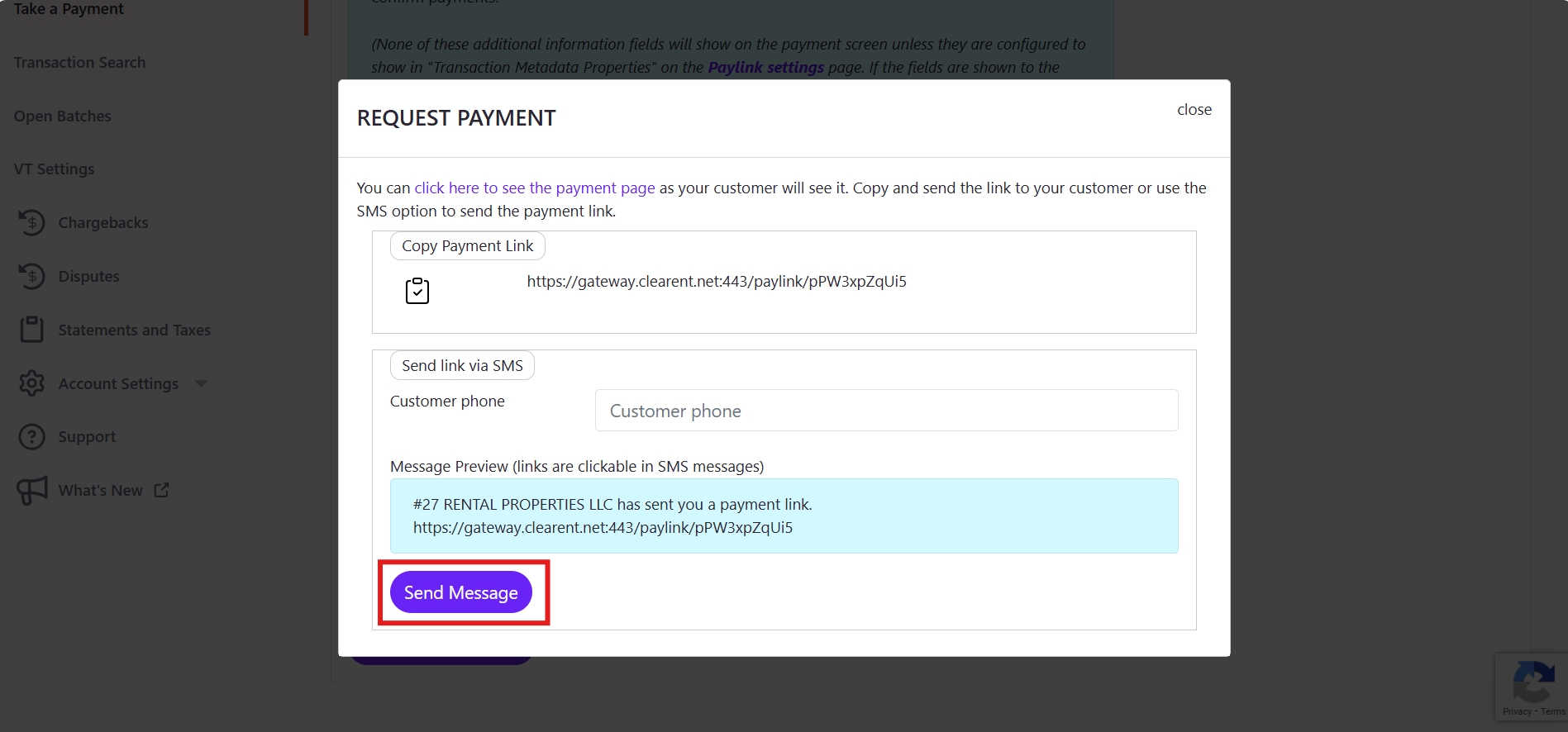 Customer Phone: Enter the customer’s phone number to send the payment link via message.