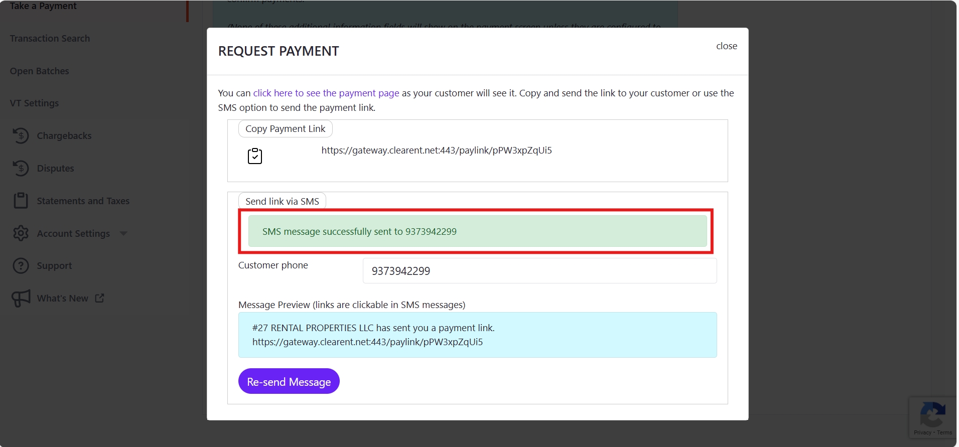 A notification appears in the Send link via SMS section of the REQUEST PAYMENT dialog when the message is successfully sent to the entered recipient.