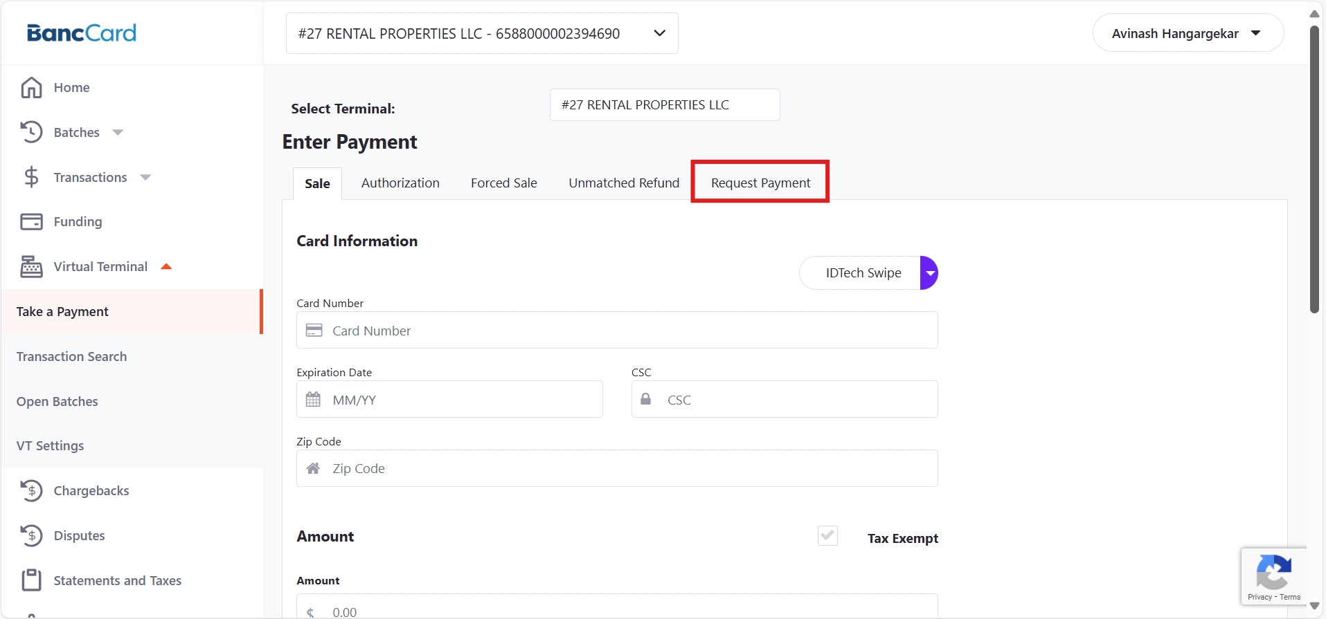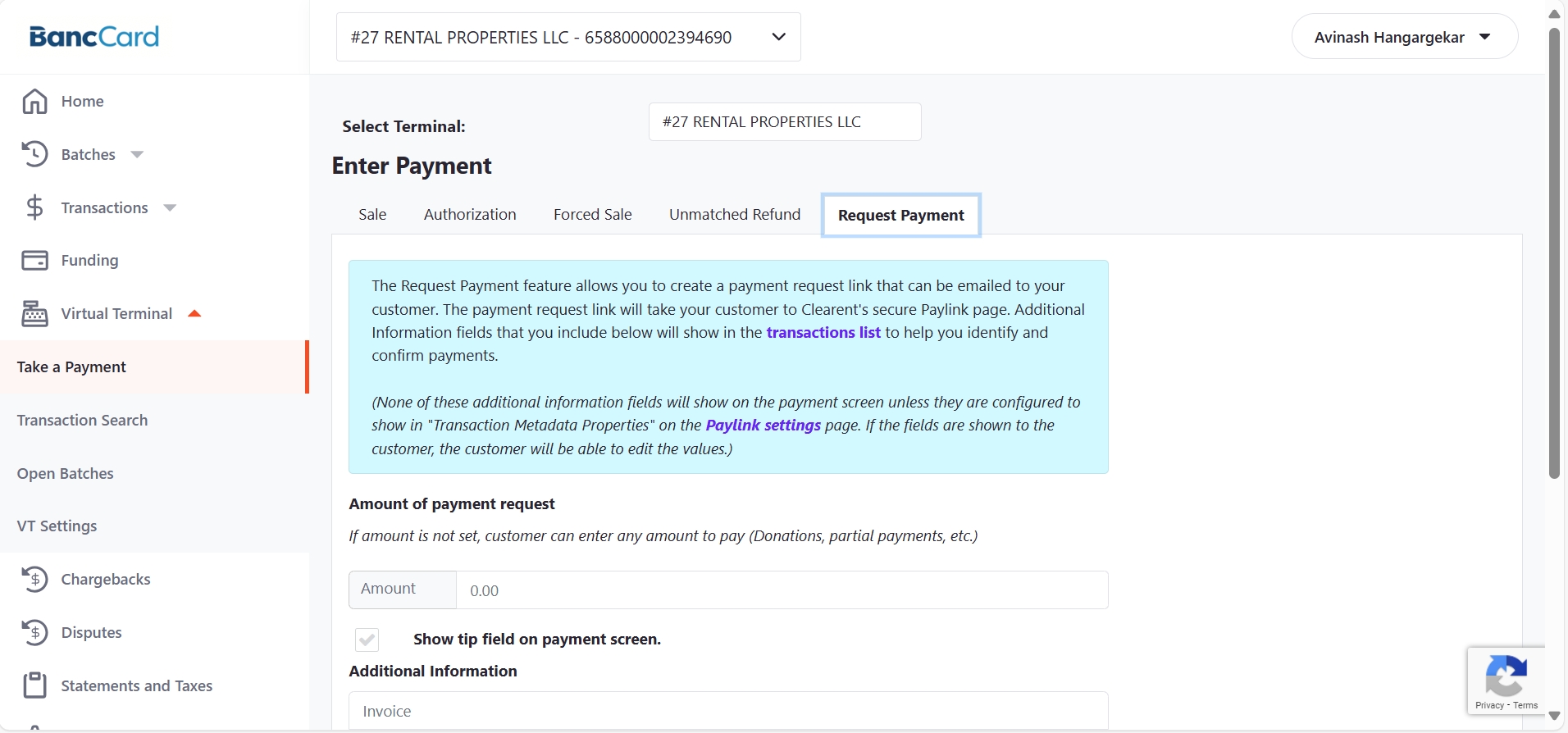 The Request Payment tab displays fields for entering information that appears on the payment form hosted on the Xplor Pay site.