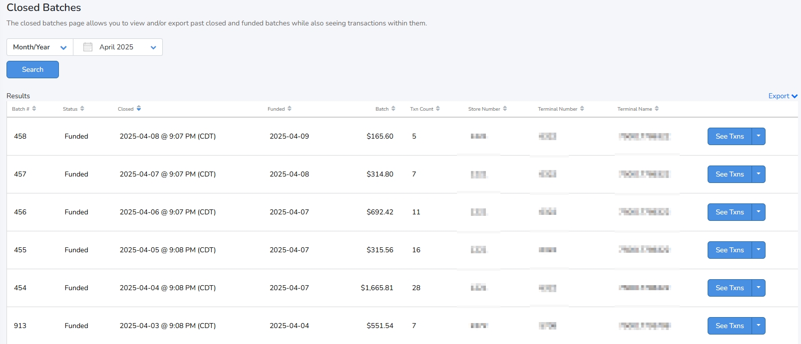 The Closed Batches page helps to view, manage, and export previously closed and funded batches. This feature helps merchants to track settled payments, reconcile transactions, and export batch data for financial reporting.