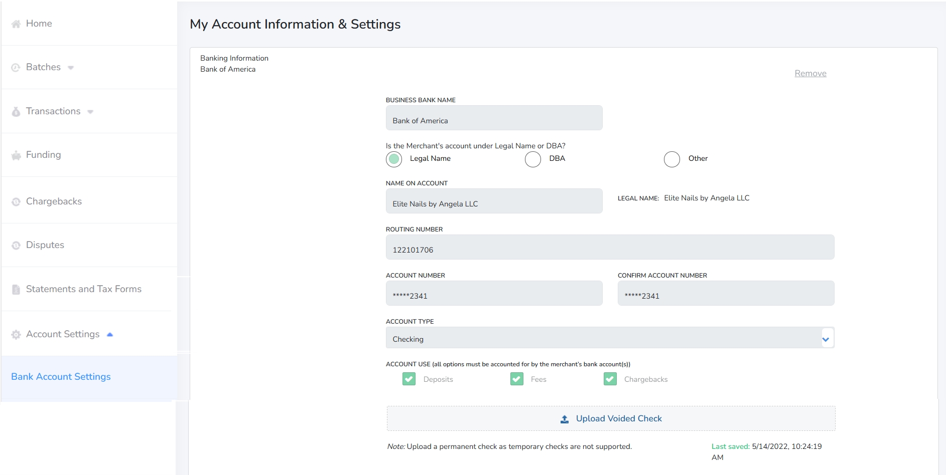 The Bank Account Settings page allows merchants to manage and update their banking details securely. This section also enables merchants to define how their bank account is used for deposits, fees, and chargebacks. Any modifications made in this section are subject to an approval process.