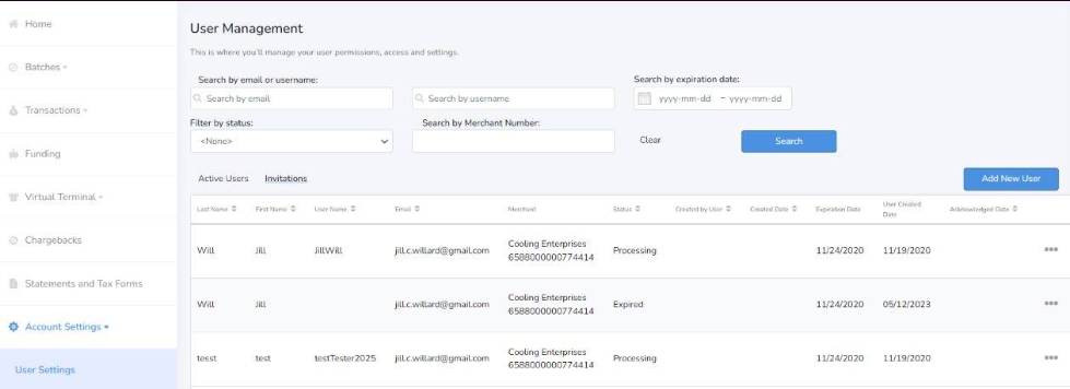 The User Management page allows you to manage user permissions, access, and settings. Merchants can search by email, username, merchant number, or expiration date. Filters help refine search results based on status. The page also allows viewing Active Users and Invitations for better access control.