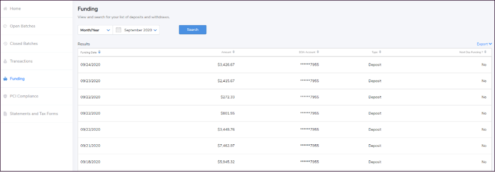 Users can select a specific month and year to view funding transactions within a chosen period.