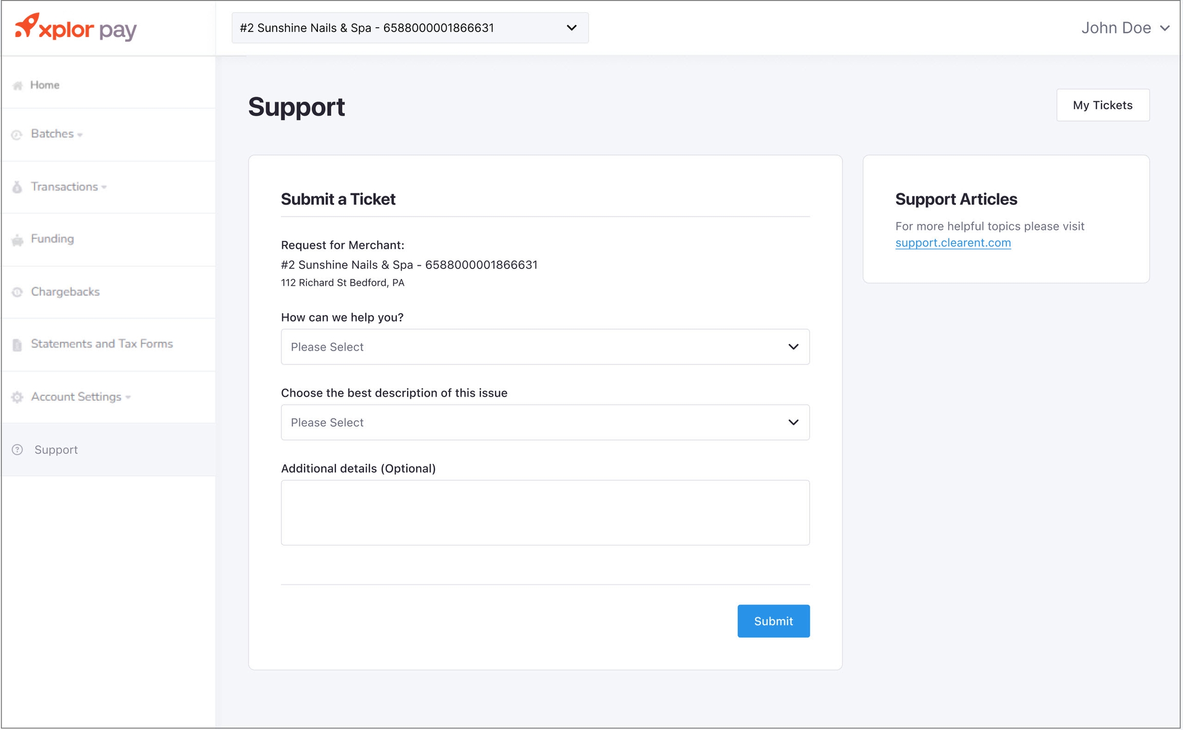The Support page of the Merchant Portal offers to submit support tickets for any issues or inquiries related to their merchant account. The required information to submit a ticket will vary based on the ticket type and will be outlined in the form. The Support Ticketing solution streamlines issue resolution by allowing you to submit and manage support requests.
