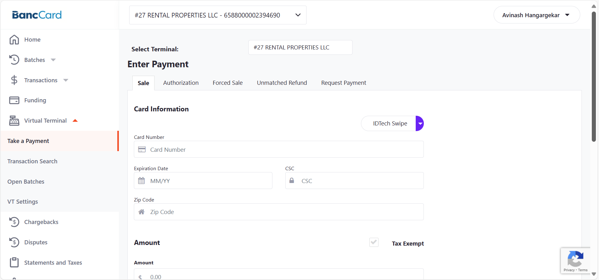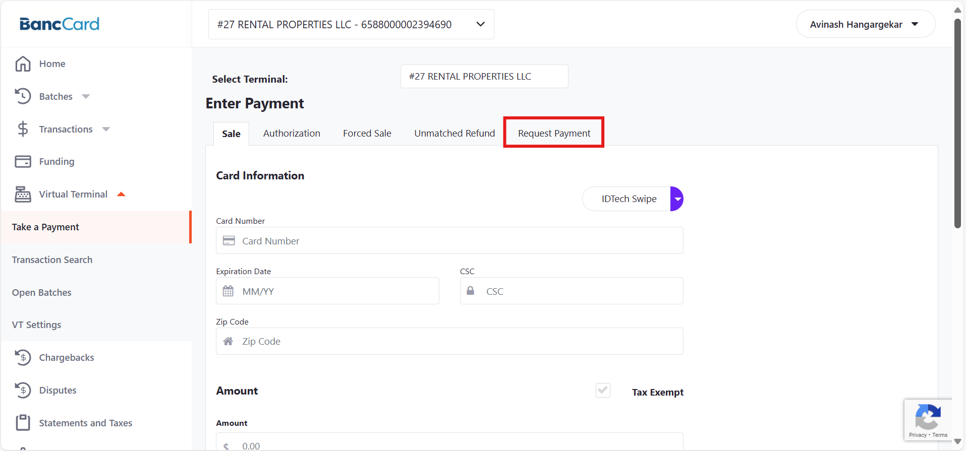 Select Virtual Terminal > Take a Payment from the menu.