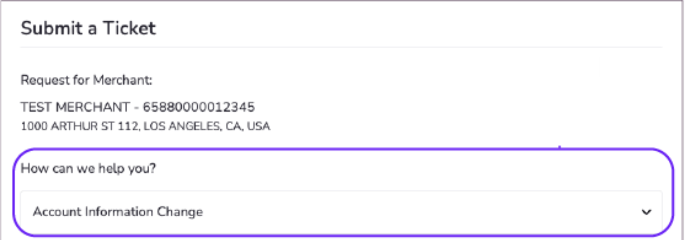 Note: Make sure you select the correct Merchant ID with the physical address from the Home screen before submitting a ticket.