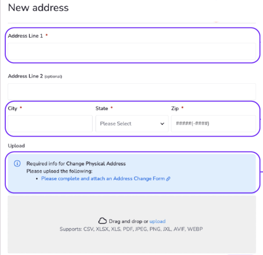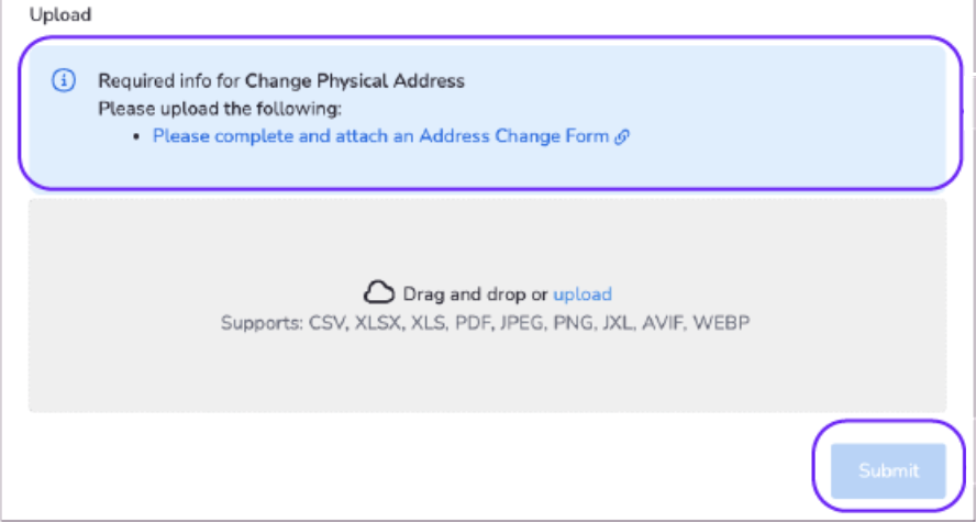 If you upload an unsupported file type, you'll see an error message. Ensure all required details are accurate before submitting to avoid processing delays.