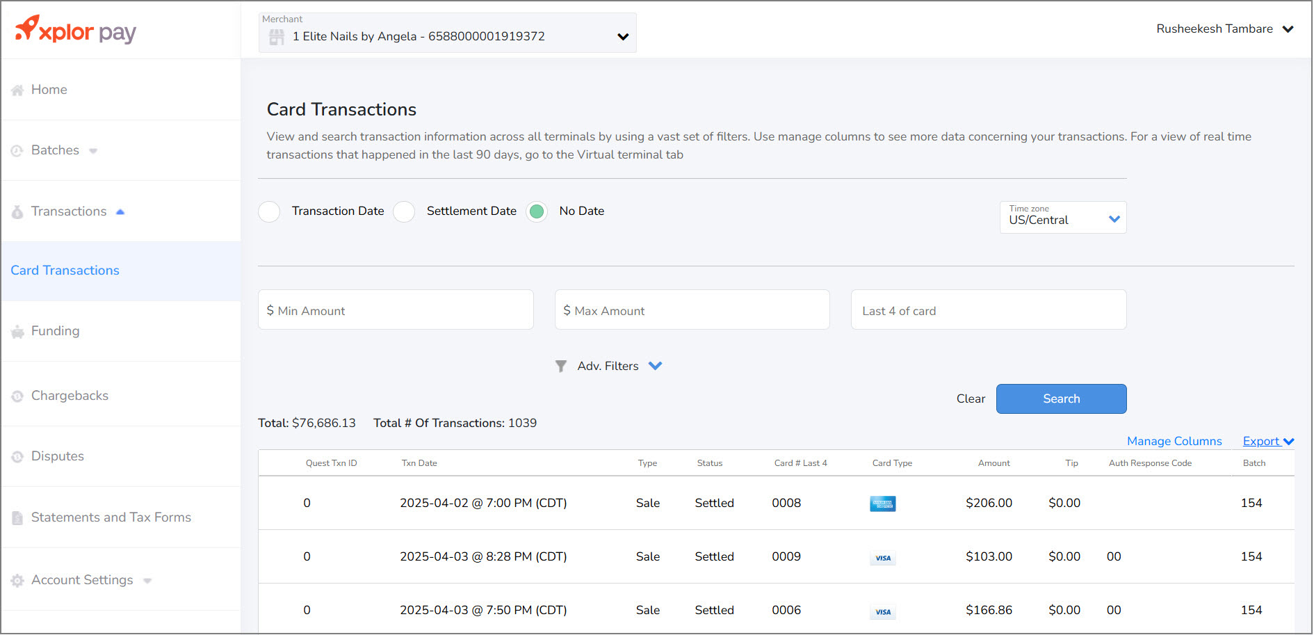 The Transactions feature in the Merchant Portal allows users to view, search, and export card transaction details across all terminals. It provides a comprehensive view of transaction activity, helping merchants track payments, refunds, and settlements efficiently.