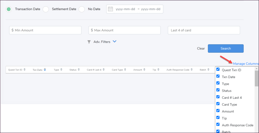 Users can enable or disable fields such as Transaction ID, Type, Status, Card Details, Amount, Tip, Response Code, Batch, and more.