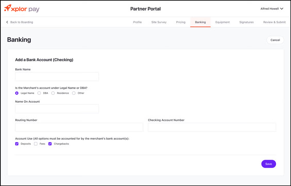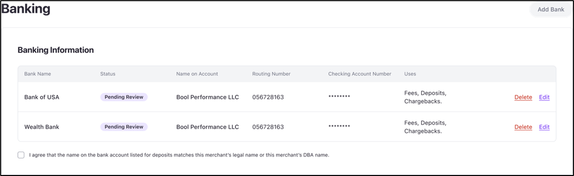 The Banking Information step allows users to securely add and manage bank accounts for transactions, including deposits, fees, and chargebacks. This step ensures that the merchant's banking details align with their legal business name or DBA (Doing Business As) name.