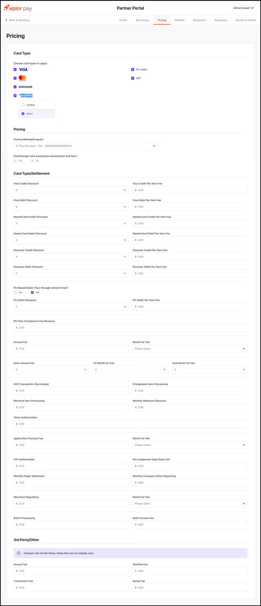 The **Pricing** section allows you to configure the merchant's pricing model, card type acceptance, fees, and other settlement-related details.