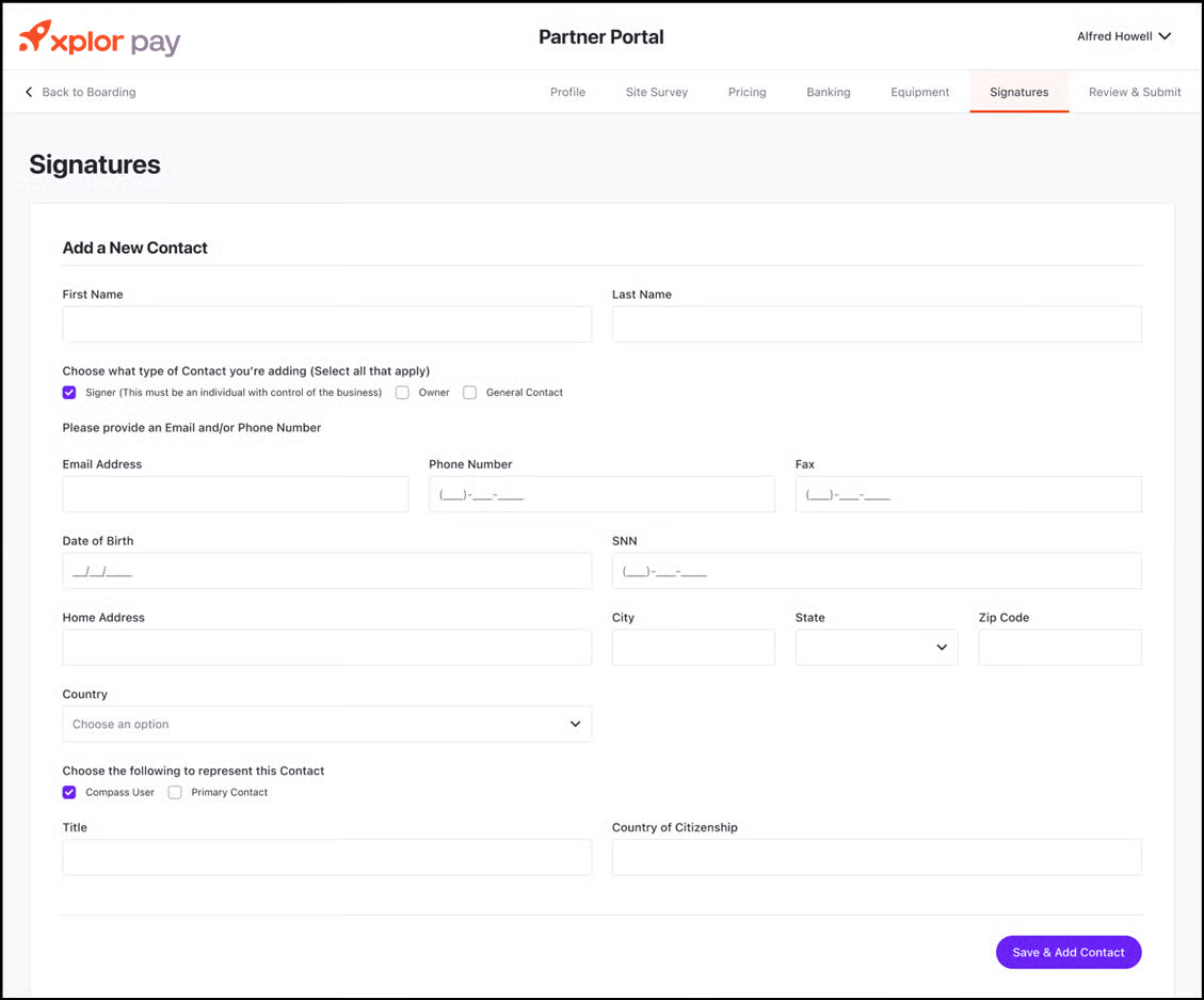 The Signature Submission step is a crucial part of the merchant onboarding process in the Partner Portal. This step ensures that all necessary contacts and authorized signers are recorded for compliance and verification purposes.